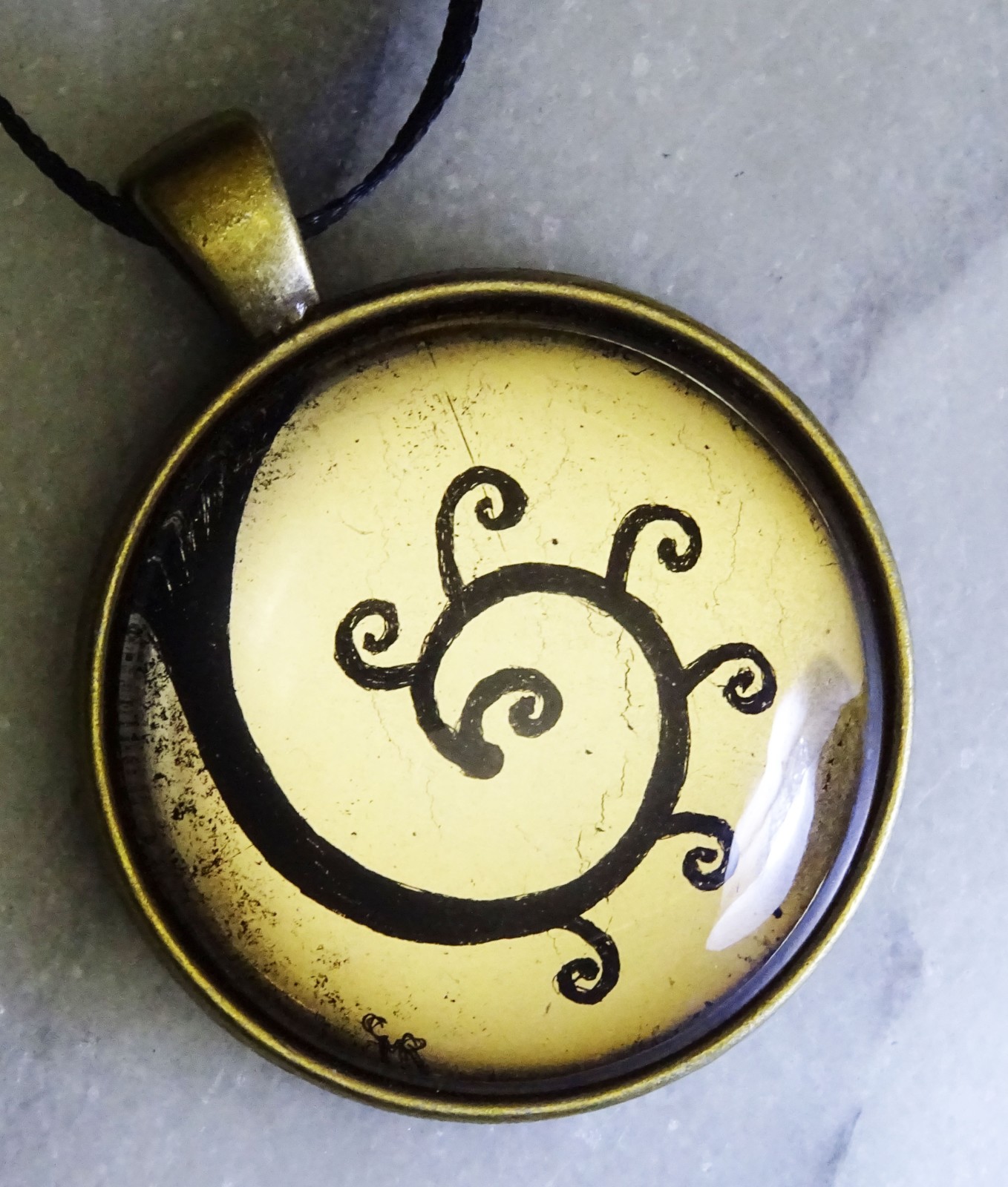 3cm diameter, domed cabochon is hung on a 1cm(w) x 60cm(L) black organza ribbon. (can also be worn on a chain of your own, not included)